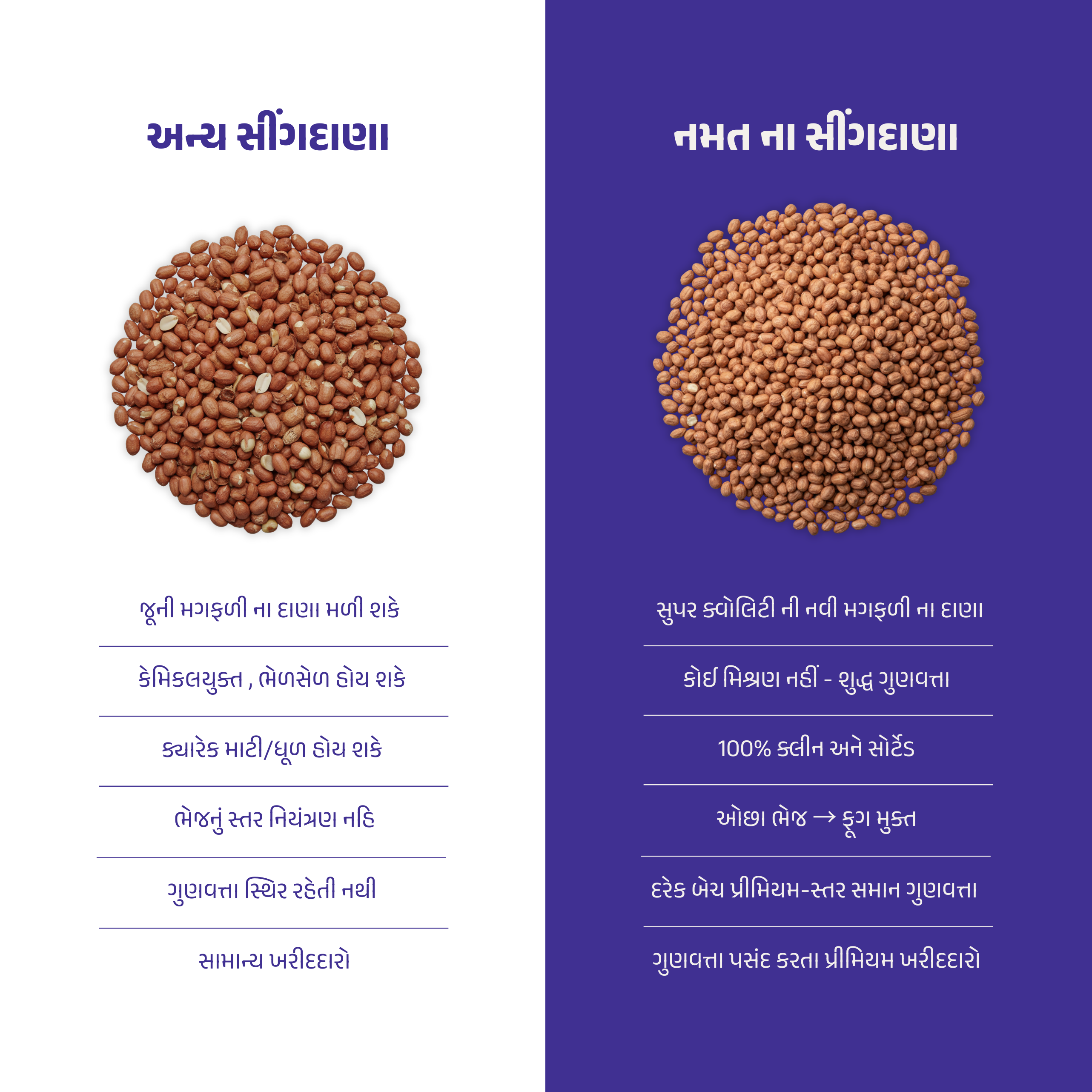 સાચા, શુદ્ધ અને ફાર્મ-ફ્રેશ મગફળી દાણા આજકાલ મળવાં બહુ મુશ્કેલ છે. બજારમાં મળતા દાણા વધારે કરીને મિશ્રણવાળા, જૂના સ્ટોકના અથવા પોલિશિંગ કરેલા હોય છે… પણ અમારા દાણા 100% કુદરતી છે — એકદમ જેમ ખેડૂતો પોતાના ઘરે ખાય છે એવાં!